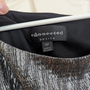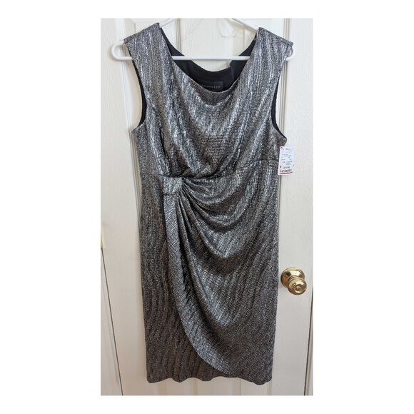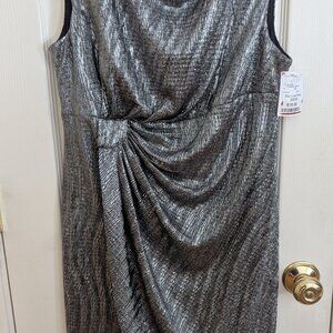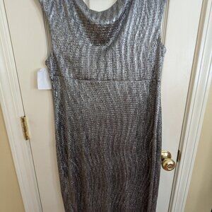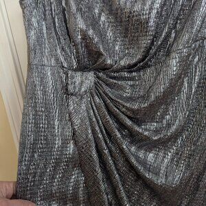 Scoop neck sleeveless sparkly silver dress, with front drape. Fully lined, Polyester, hits just below knee if you're short. Was originally from TJMaxx. Material has texture. It will flatter many figure types, size 12 petite. Quick ship.
