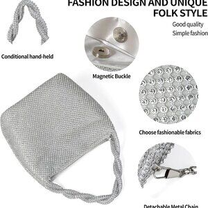 Features: This dazzling evening bag is covered in shimmering rhinestones and has a sleek pleated design that really catches the light. The versatile 2-in-1 style lets you use it as a clutch, shoulder bag, or crossbody with the included adjustable chain strap. Perfect for weddings, parties, or any formal event where you want to stand out.