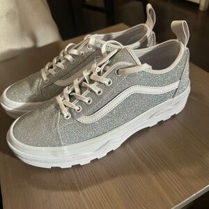 Shimmering silver sneakers with white accents. Perfect for adding sparkle to any outfit.