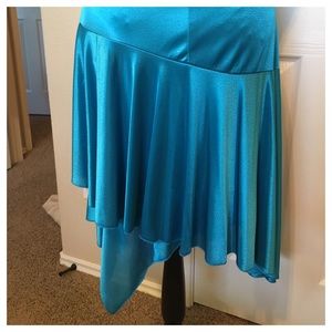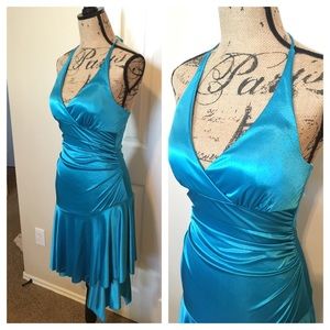 JUST LIKE NEW! ⚜ Sparkly Sky Blue Cocktail Dress | Halter Ties at Neck • Padded Cups | Dusted Shimmer Throughout Garment 🍾 Perfect for Summer Evening Parties and Dancing! Asymmetric Hem Moves Beautifully when Walking ⚜ Worn Once & Dry Cleaned - 🏷 Purchased at Macy's ⭐️ Measures (lying flat) 14" Bust, 13" Waist, 34-39" Legth from Halter to Hem • Very Stretchy, Flattering Satin 💙 Feel Free to Make an Offer!