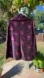 Can be worn by an adult or a kid. Ties at the neck. Soft, medium weight black fabric with super sparkly purple spiders and spiderwebs design.
