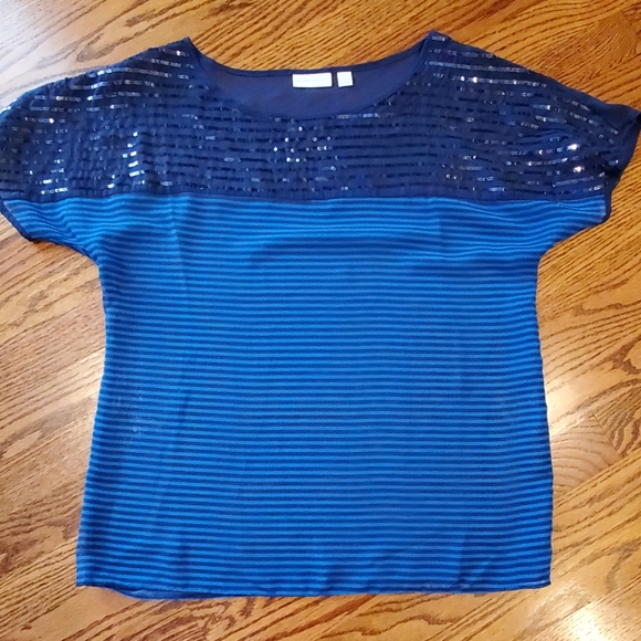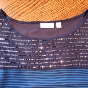 Very cute blue top with sparkle on top. Navy and bright blue striped. Great for dressing up! Size small, but will fit medium.