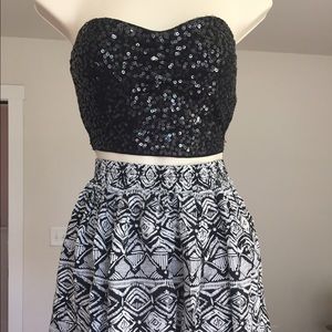 Strapless bandeau with sequins, comes down to above belly button. Could be crop top/tunic