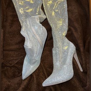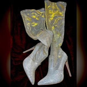 Sparkly knee high boots with hints of gold and silver. These are brand spanking new (never worn) and are indeed are a show stopper. I took pics with/without flash to show sparkle.