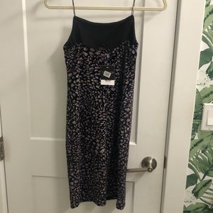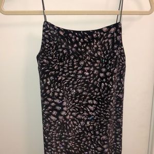 Faux velvet, black mini dress in sparkly leopard print. Sparkles are multicolored on top of a grey/silver leopard print. Never been worn. No damages