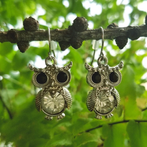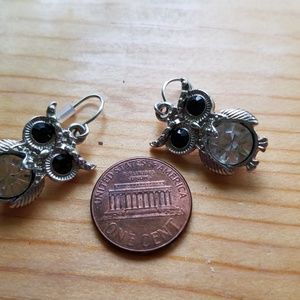 Drop-style, silver-toned owl earrings. Black and clear glass accents.