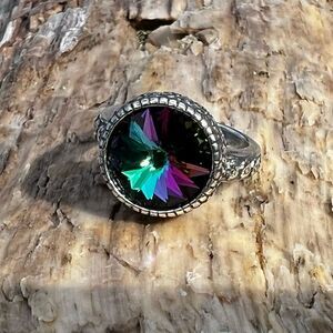 Beautiful handcrafted ring made with a Swarovski crystal in a beautiful mixed color crystal and super sparkly in a 12mm rivoli chaton. My husband and I make our jewelry using genuine Swarovski crystals. All items are brand-new and so much prettier in person than in pictures. Proceeds used to help our five-year-old granddaughter Lila May in her fight against cancer, but she lost her battle. Donations will go to other neuroblastoma charities. 910