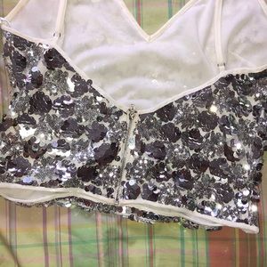 Gorgeous silver sequin top with low black. Super cute paired with high waisted jeans or skirt. Worn only 2 times.