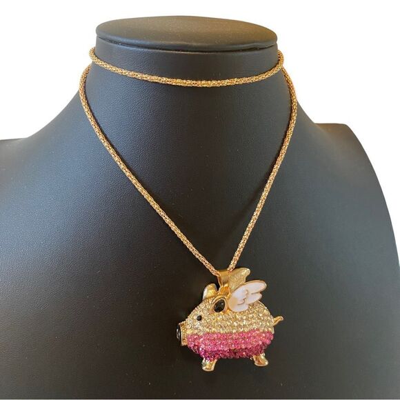 Sparkly Adorable Flying Pig Necklace on Long Gold Toned Chain.