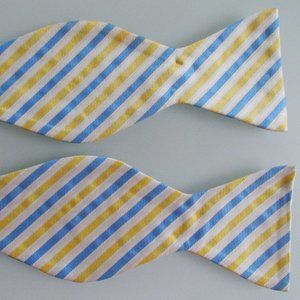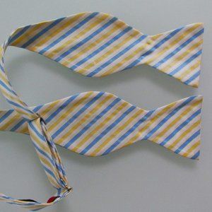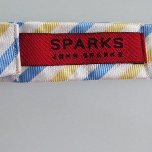 Description: Up for sale is a Sparks self-tie butterfly end bow tie. The bow tie is unmarked as to the fabric content. The width of the tie is 2.75." with full neck adjustments. This bow tie has a multicolored striped pattern in pastel yellow, blue, and white. Please see the photos for a more accurate depiction of color and print. The bow tie is in excellent condition.