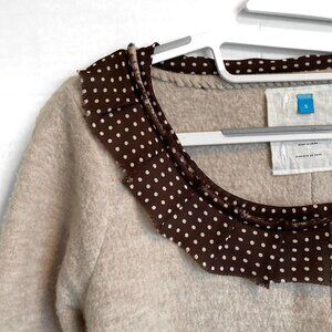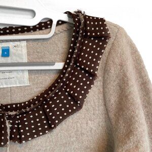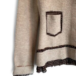 Chic beige cardigan with brown polka dot trim. Features two front pockets. Perfect for layering.