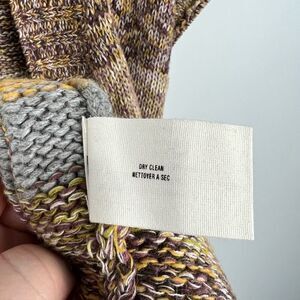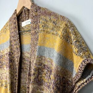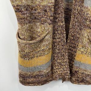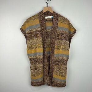 Pre-owned great condition. Cotton/lambswool/angora rabbit hair/cashmere blend. Brown and yellow multicolored stripped knit long open front vest with pockets. Pit to pit= 22”, shoulder to hem= 31”