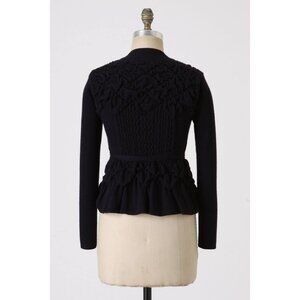 Short navy cardigan from Sparrow (Anthropologie). Cute puffy smocked knit texture for a cozy fit. Tie waist closure. Long sleeves.