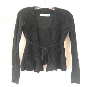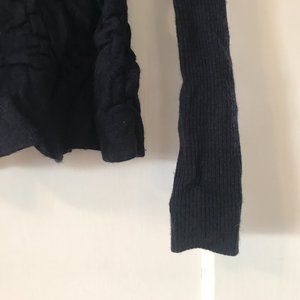 Short navy cardigan from Sparrow (Anthropologie). Cute puffy smocked knit texture for a cozy fit. Tie waist closure. Long sleeves.
