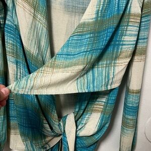 Chic tie-front cardigan with teal and cream plaid design. Perfect for layering and casual wear.