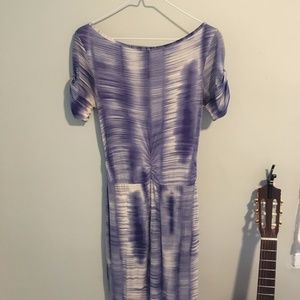 Exceptionally flattering dress from Anthropologie by the brand Sparrow. Gathers in all the right places! Stretchy jersey material. Doesn't wrinkle. Dyed pattern in purpley blue. Tulip hem.