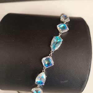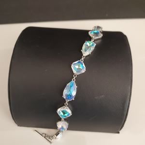This Spartina 449 bracelet has faceted aurora borealis stones in a silver tone setting that change color depending on the light and background. Sometimes they appear clear and others they are blue. 7 1/4 inches long with a toggle clasp. Very good condition. Please review all photos.