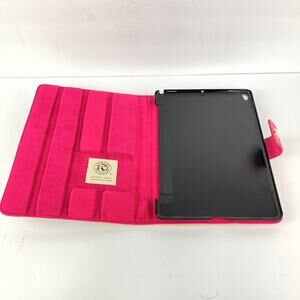 Hard to say with any absolute certainty which generation of I pad this cover fits, it could fit a 5th, or 6th generation i pad. The holder frame measures 9.75" X 6.75". The cover is heavily padded with a fine linen cover. Magnet clasp and edge trim are genuine leather. Overall size is 7.5" X 10.25" X 1" thick.