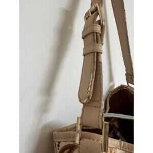 Beige/Brown patterned linen front and back. Big pocket on back. Shoulder bag. Many inside pockets. Leather tie. Note: Adjustable leather strap is worn. Leather tears. Rest of bag in very good condition. Retired.