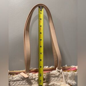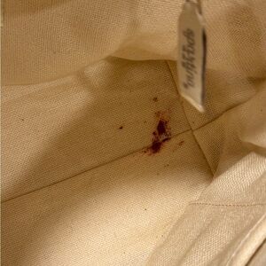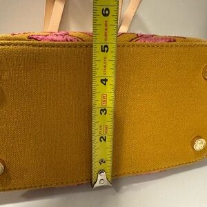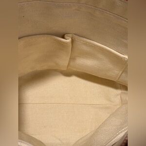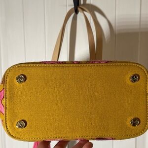 Such a fun bag with bright colors! Pom Pom bag charm. Zipper works great! There is a lipstick stain on the inside and a little mark where the spartina logo is on the front. Outside of that, this bag is in wonderful condition!