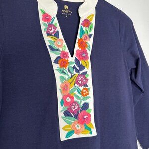 Spartina 449 Embroidered Monica Shift Dress Size Small Navy Blue Stretch Boho