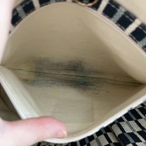 Spartina 449 Jetsetter Tote White Cream Blue Cream Stripe Geometric Large Travel Pre-owned in good condition. Clean exterior (one small light mark on bottom), a few dirty spots on interior lining as pictured. Beautiful roomy tote.