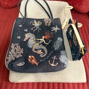 These bags are very nice practically new the large bag has mermaid embroidered on the front and has a snap closure on top, there is a large pocket on the rear, mermaid tail attached to the zipper closure. There is numerous pockets inside and the crossbody has the same design on it, has a top zipper closure with a mermaid design on the zipper there is numerous pockets inside the crossbody also and the crossbody strap can be removed and carried in the hands or large bag. The large bag is 12 inches wide and 14 inches long and the crossbody bag is 7.5 inches wide and 5 inches long.