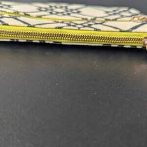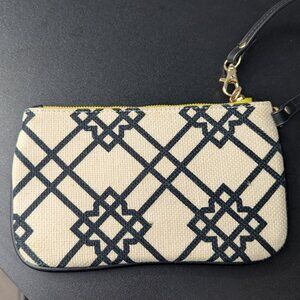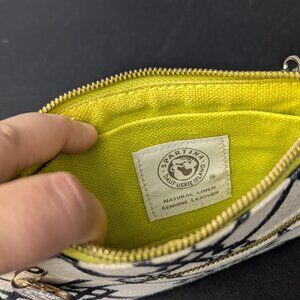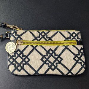 Spartina 449 Large Wristlet Wallet-Geometric Black and Green- Preowned. Linen and leather with two zippers