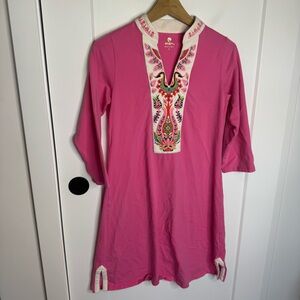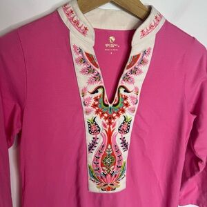 Spartina 449 Monica Pink Embroidered Bird Tropical Mini Long Sleeve Dress Small