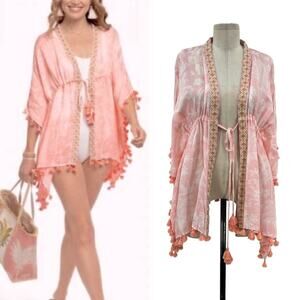 Featuring allover palm print, pink tassel trim, open front with tasseled drawstring waist, and kimono sleeves.