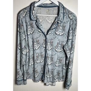 The Spartina 449 Women's Large Modal Stretch Staffordshire Dogs Pajama Top is a cozy and stylish addition to any sleepwear collection. Featuring a fun animal print pattern of dogs, this long sleeve top with a collared neckline and button closure offers a comfortable fit. Made from a blend of spandex and modal with a soft jersey fabric type, this pajama top is machine washable for easy care. Perfect for all seasons, this blue top with accents of button detail is ideal for lounging in style.