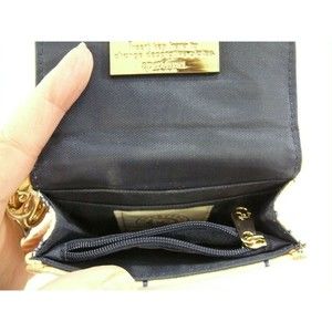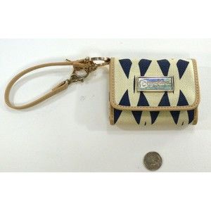 Super nice, compact. Flap with snap. Small zipped change pocket and slit pockets on either side. Has transparent ID window on the back exterior of the wallet. Wristlet with attached key to change out gold plates. Measures approx: 4 1/2" wide by 3 1/2" high (closed).