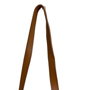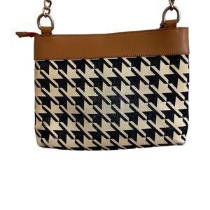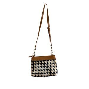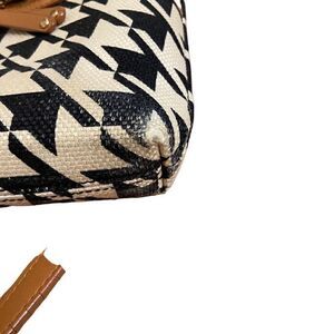 Black & cream houndstooth sturdy linen with red lining & gold hardware. Brown leather accents. Three outside zip pockets. Beautiful mermaid logo details in the pulls. One inside zip pocket and two inside slip pockets. Adjustable crossbody strap has some cracking along edging. Wear as shown.