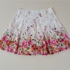 There’s nothing prettier and more feminine than a floral skirt! This one, by Speak 2 Me, is a white background with a bottom floral of pink, orange, tan and green- and is fully lined. It can be worn in so many different ways and will become a classic piece that you can wear time and time again. It's the perfect look any day of the week! Skirt is in excellent condition, like new.