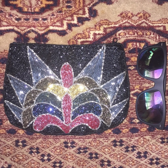Fully- beaded on both sides, top zipper and fully lined with extra pocket inside. No beads missing. See photo for size comparison. Also: SHINY!