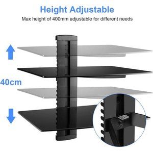 🧿Durability: our wall mounted shelf is built with one large strengthened tempered glass shelf (380x280x4mm each shelf), Designed for DVD/Blu-ray players, satellite/cable boxes, games consoles, hi-fi and surround sound speakers.