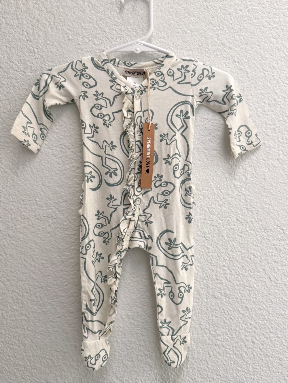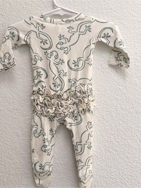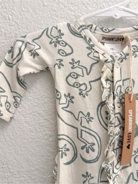 New with tags, size Newborn. Bamboo. Ruffled footie pajamas with snaps. Cute gecko print