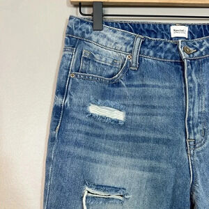 Keywords: Special A jeans, light wash distressed jeans, size 7 jeans, boyfriend fit jeans, style P7024ML-SA, 100% cotton jeans, casual jeans, trendy denim, EUC, distressed boyfriend jeans, frayed jeans.