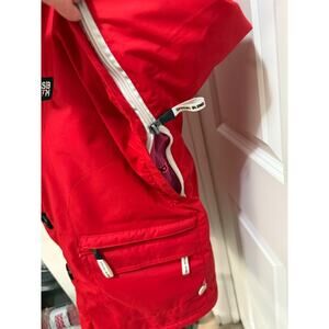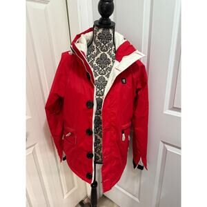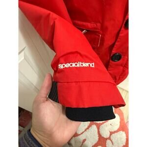 FREE SHIPPING!!! This is a red Special Blend waterproof jacket for women in size medium. It features a hood, long sleeves, and a zip closure. The black buttons are both functional and aesthetic. The jacket is designed for winter snow sport and I have worn it to ride on the mountain a couple times. Made of nylon with a woven fabric type, it is insulated, water-resistant, and windproof, with zipped pockets, inner pockets, and an elastic waist for a comfortable fit. Last photo shows some small dark staining/ scuff marks that came from the lift/ riding, not food based.
