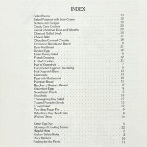 This charming spiral-bound cookbook offers engaging recipes and delightful illustrations, tailored for children. Created in 1980, it provides simple instructions for young cooks. Colorful and vibrant graphics. Some inside pages are included in the above photos.
