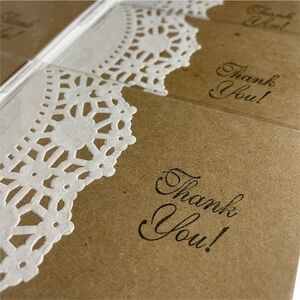 Special Doily Thank You Card Bundle. Set of 6. Cards are great for weddings, birthdays, hostess gifts, teacher appreciation notes & to even just to share a little gratitude for someone meaningful to you. These cards are made with a light chipboard and paper doilies. The chipboard is a recycled product that has marks of individuality within each piece.All cards measure 4.1 X 5.8 inches (10.5 X 14.8 cm) - A6 card. Cards come with a white envelope & kept in a clear sleeve for protection until use.