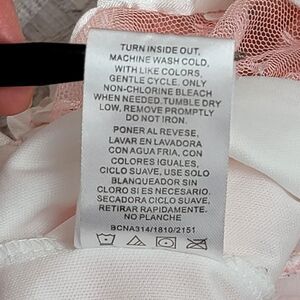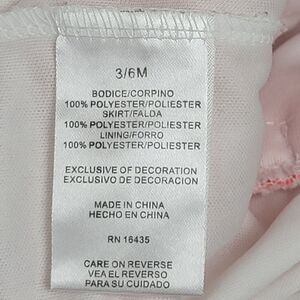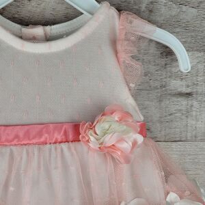 Absolutely darling infant dress has a light pink tulle outer layer, bright pink satiny ribbon strip along the "empire" waist with three dimensional flower accent and three dimensional pink and white flowers all along the lower bubble hem. Perfect "I'm 3 months old" photo session dress!