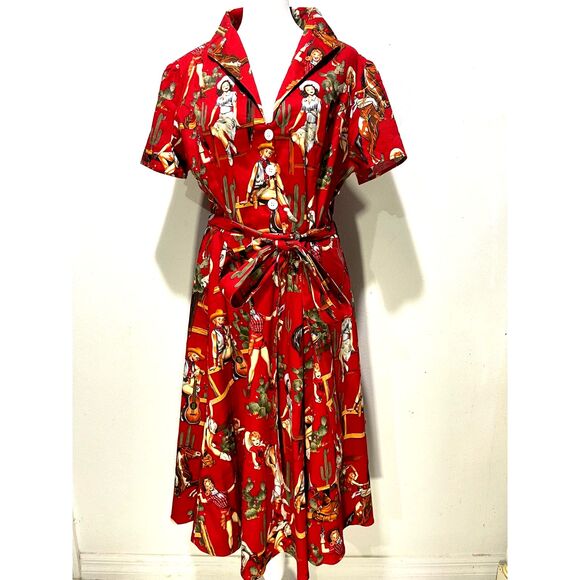 Special editions red cowgirls print swing shirt dress western rouge 60's retro women 3XL. See measurements for fit