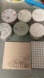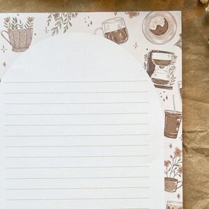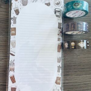 3 notepads form papermint coffee larger one $15, green plaid and mushrooms smaller ones each $4