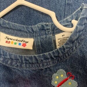 Adorable denim dress with vibrant floral accents. Ideal for fun outings. Used Sold As Is