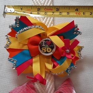 ▪︎"I ♡ 80's" multi-colored hair bow made of grosgrain and rhinestone, partially covered alligator clip (5" x 4")