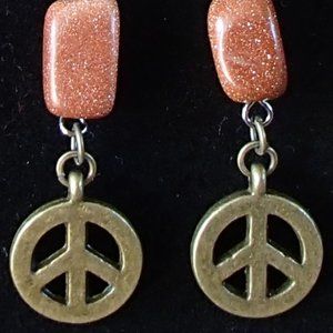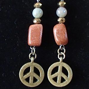 The earrings feature Speckled Goldstone, Labradorite, brass Rondelle spacer beads with a brass peace sign dangling down. The earring wires/hooks are also brass.