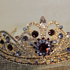 Gorgeous and ready for Cosplay or a Princess Party. Set in gold metal, rhinestones are blue, pink, purple, lilac, and aurora borealis. End loops for bobby pins or ribbon. Approximately 2.25 inches tall. All rhinestones intact.