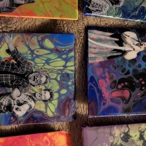 Set of vibrant magnets featuring musicians. Each magnet has a unique colorful design with a mix of blue, green, orange, and purple backgrounds.