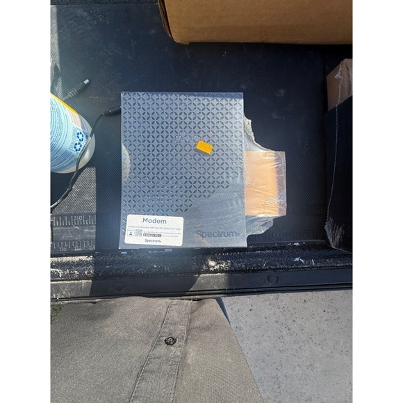 Got this Spectrum modem here, looks like the EU2251 model. It's still got the plastic on it and a price tag from somewhere else, but I haven't tested it out myself. Good if you're looking to replace a rental or just need a spare for your setup. Pretty standard black box with the pattern on top. Selling as is since I dont have a way to hook it up right now.